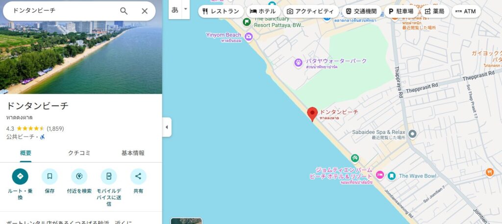 ドンタンビーチは、ジョムティエンビーチから北側へ続く約1.5kmほどの海岸線。パタヤ中心部からは南へ約4kmほどの距離にあります。
