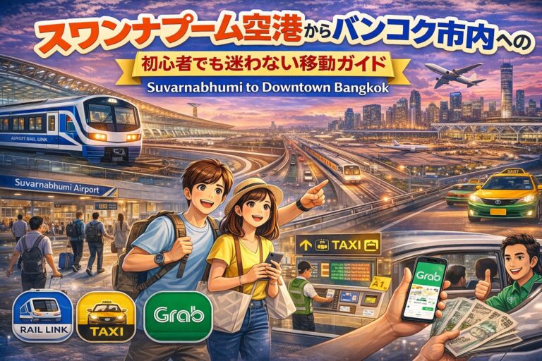バンコク 初心者向け, バンコク, バンコク 交通&移動, 重要なお知らせスワンナプーム空港からバンコク市内への行き方|初心者でも迷わない移動ガイドバンコク旅行で多くの人が最初に悩むのが… 2026年3月16日