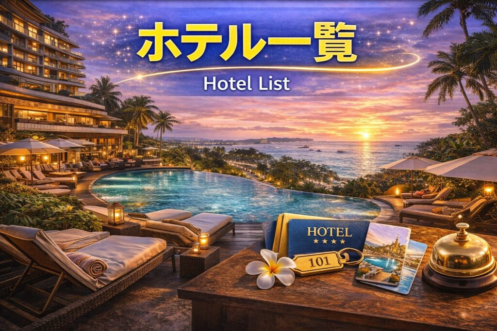 パタヤにはリーズナブルなホテルから高級リゾートまで、さまざまなタイプの宿泊施設があります。ビーチ沿いのリゾートホテルや、中心部でアクセスの良いホテル、静かなエリアでゆっくり過ごせる宿など、目的によっておすすめのエリアやホテルの種類も変わってきます。