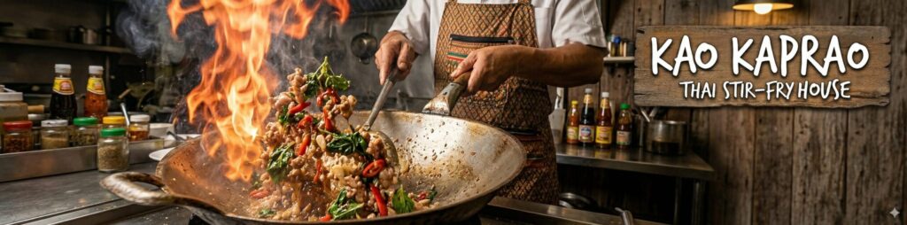 パタヤで「本当に美味しいガパオ」を食べたいなら外せない、ガパオ専門店です。注文が入るたびに強火で一気に炒め上げるガパオは、香ばしさと辛みのバランスが絶妙で、一度食べたら忘れられない味です。