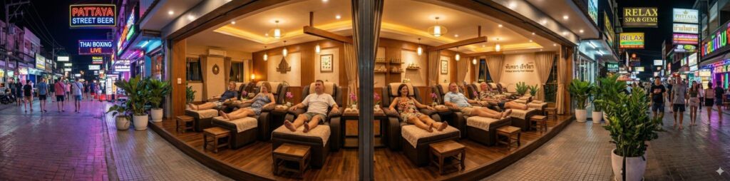- フットマッサージは「外」がおすすめ: 通りに面した椅子で受けるフットマッサージは、行き交う人々を眺めながらパタヤの熱気を感じられる最高の特等席です。